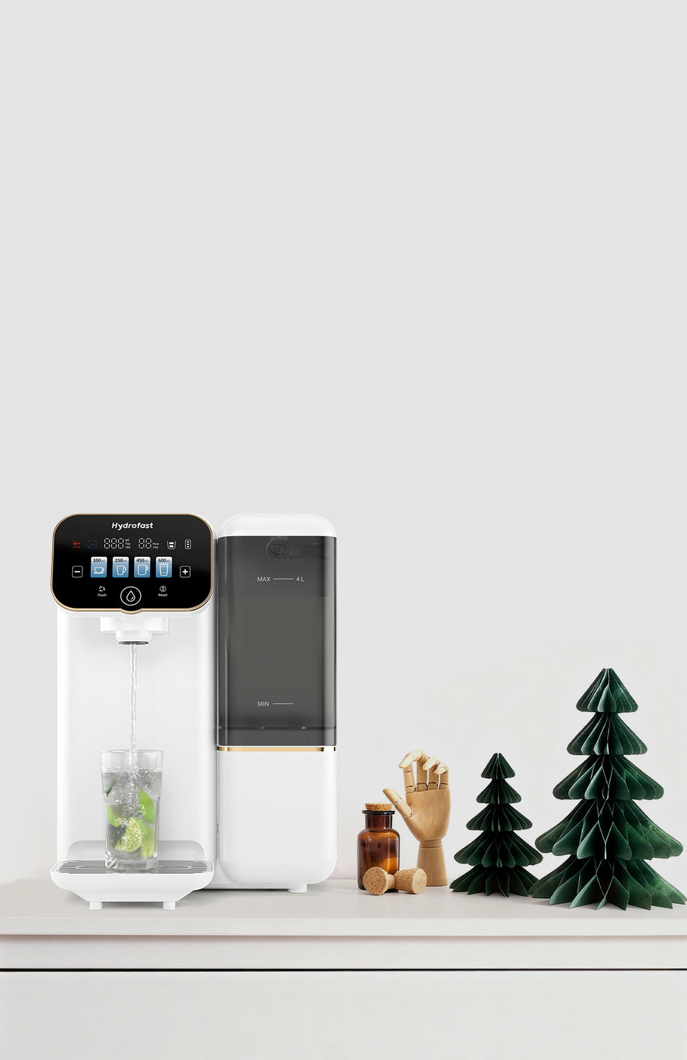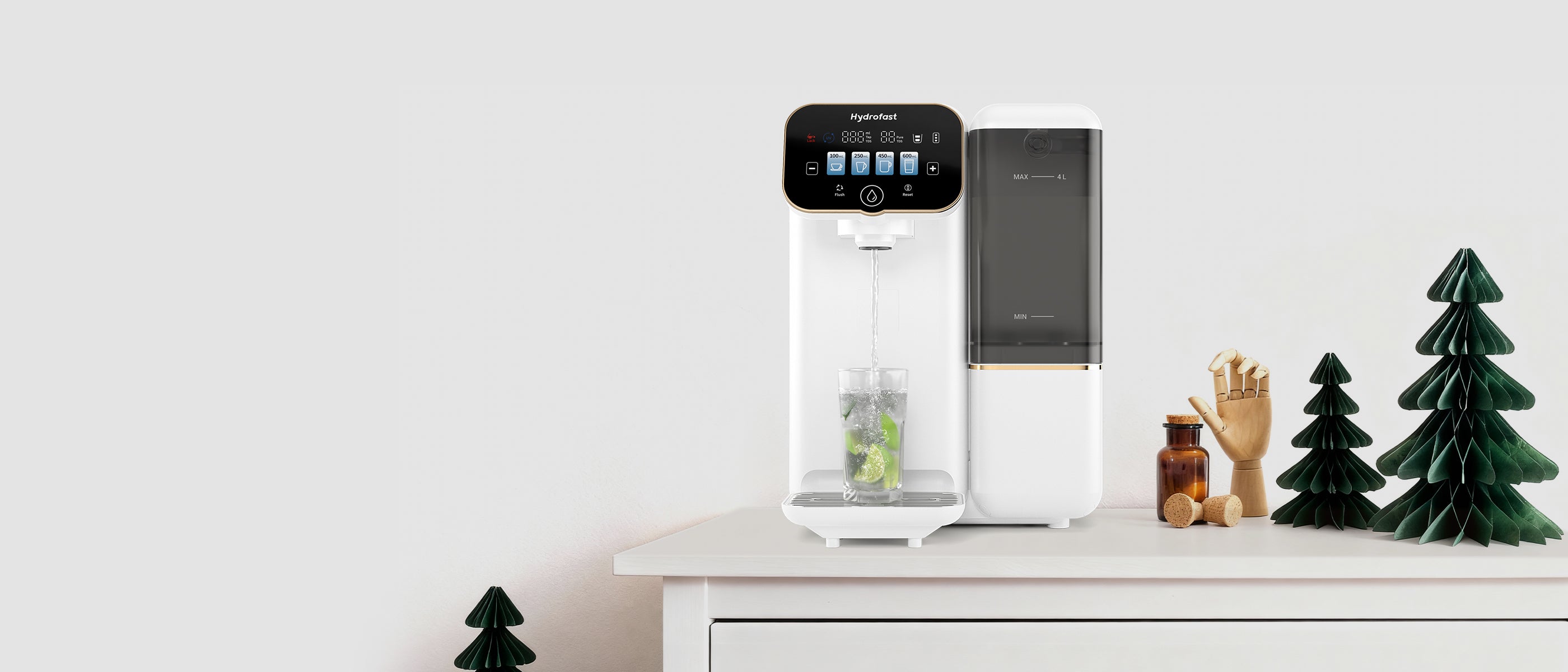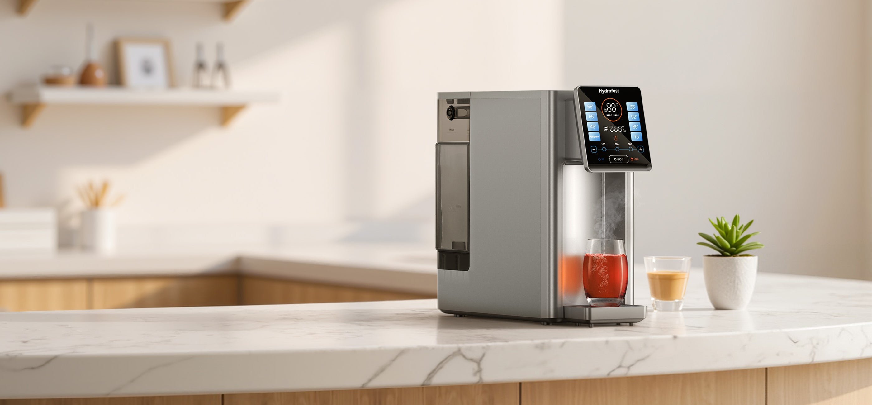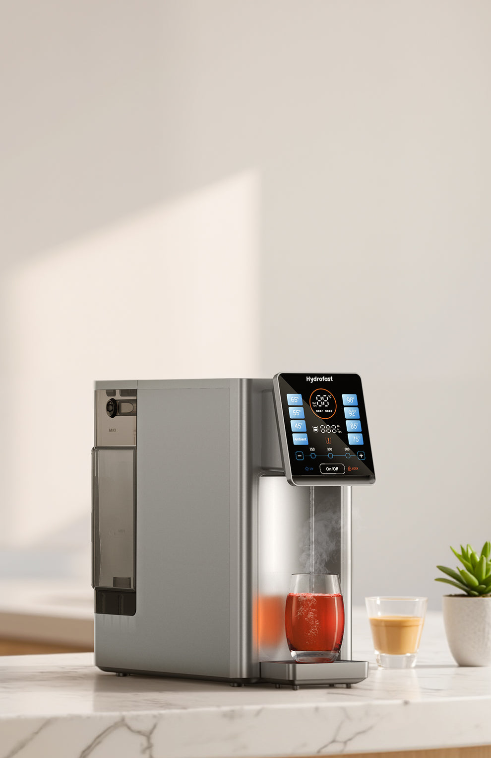 Hydrofasy is perfect! No installation, and the side-mounted tank is so convenient. The 5-in-1 filter is easy to maintain. The water tastes amazing!