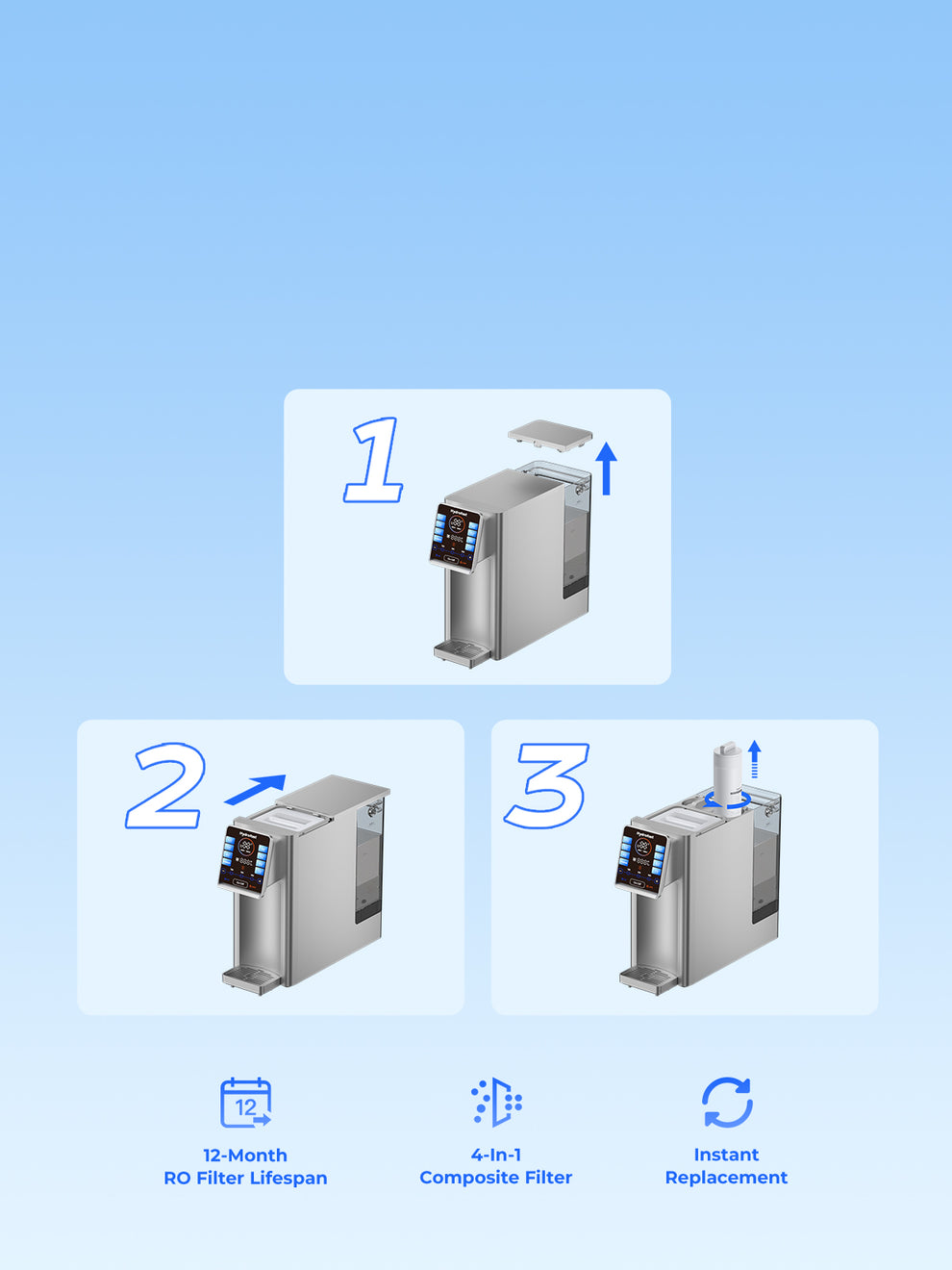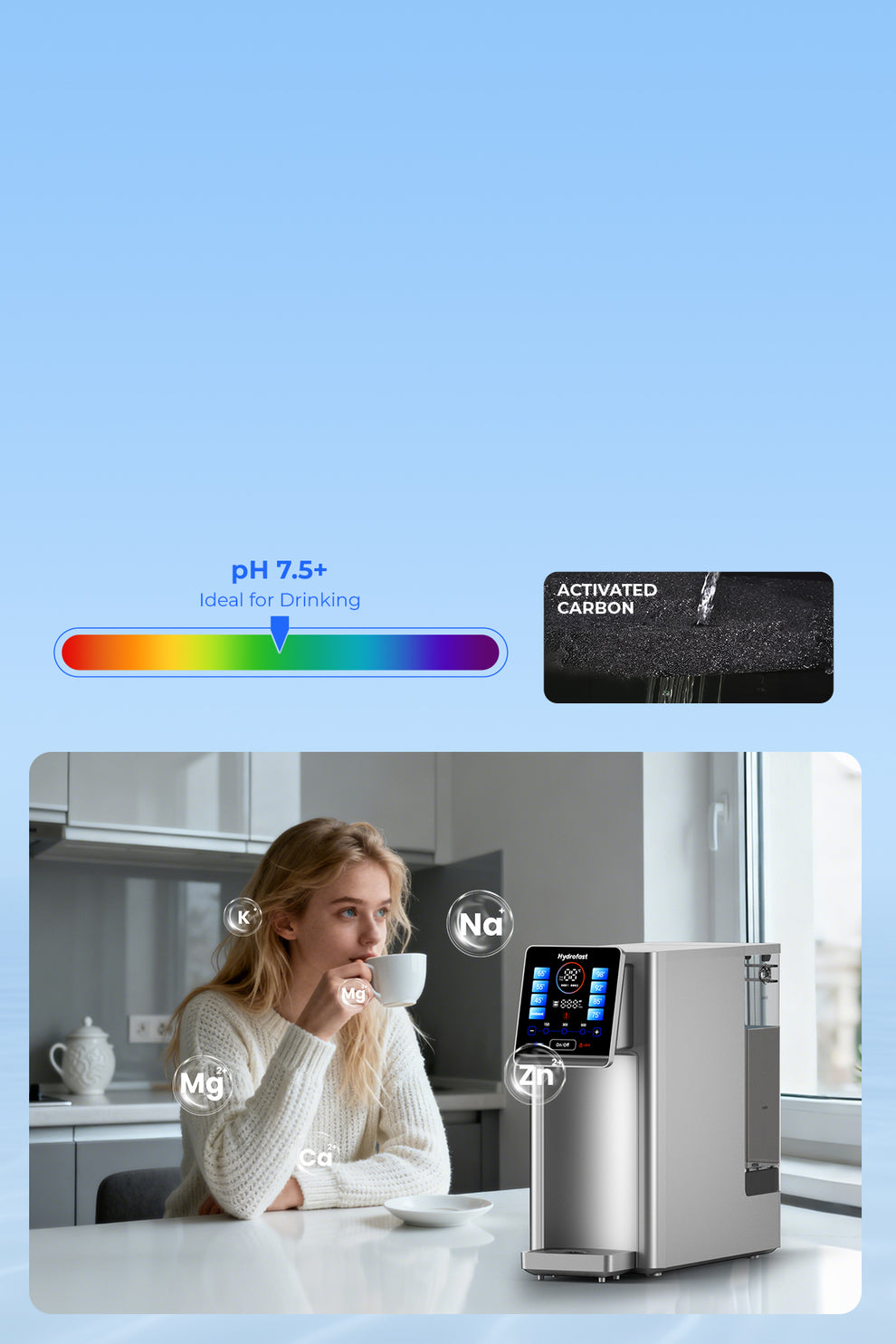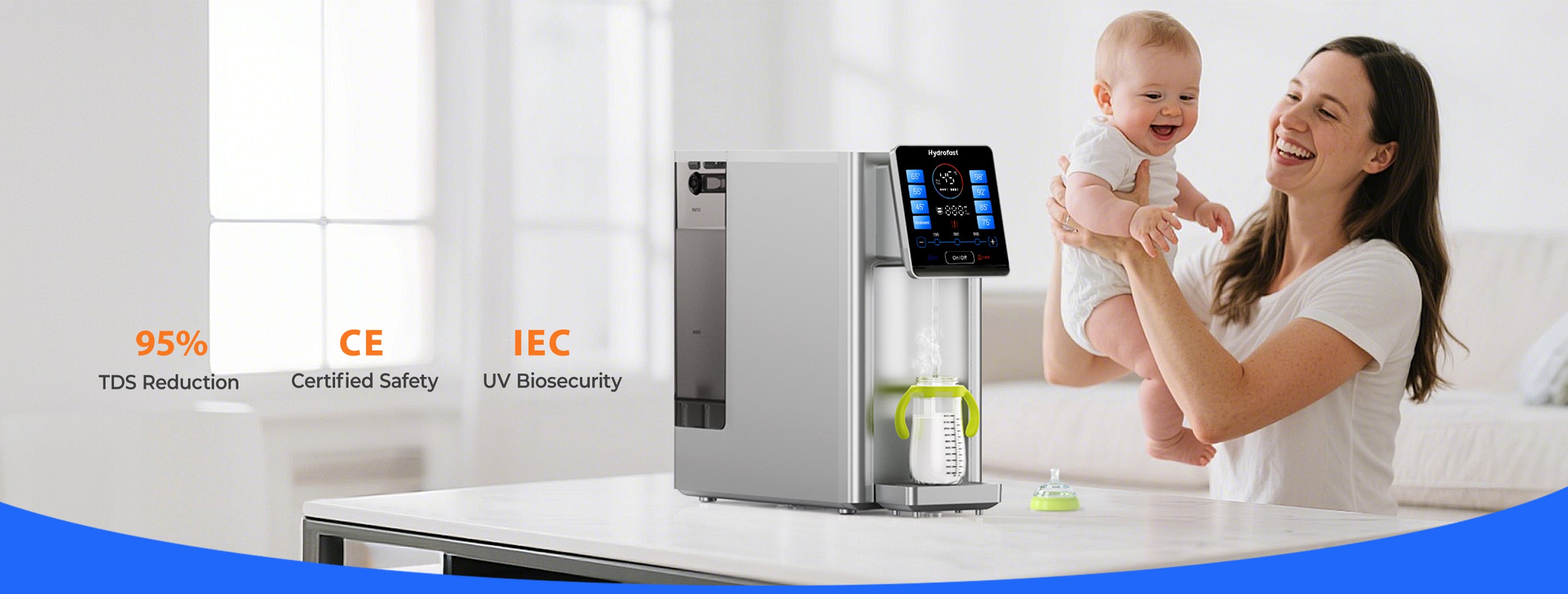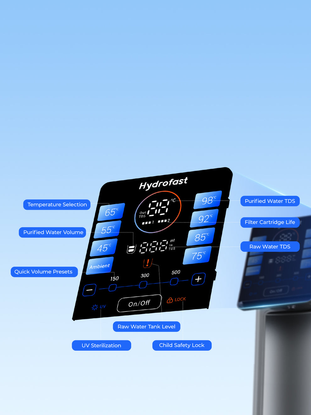 Hydrofast W100 is designed for healthy living, delivering crisp, pure drinking water. It features eight temperature settings and fifteen volume options to meet your needs for preparing infant formula, loose-leaf tea, or coffee. Its efficient six-stage filtration system, UV sterilization function, and intelligent TDS monitoring ensure you and your family enjoy pure, mineral-rich drinking water.