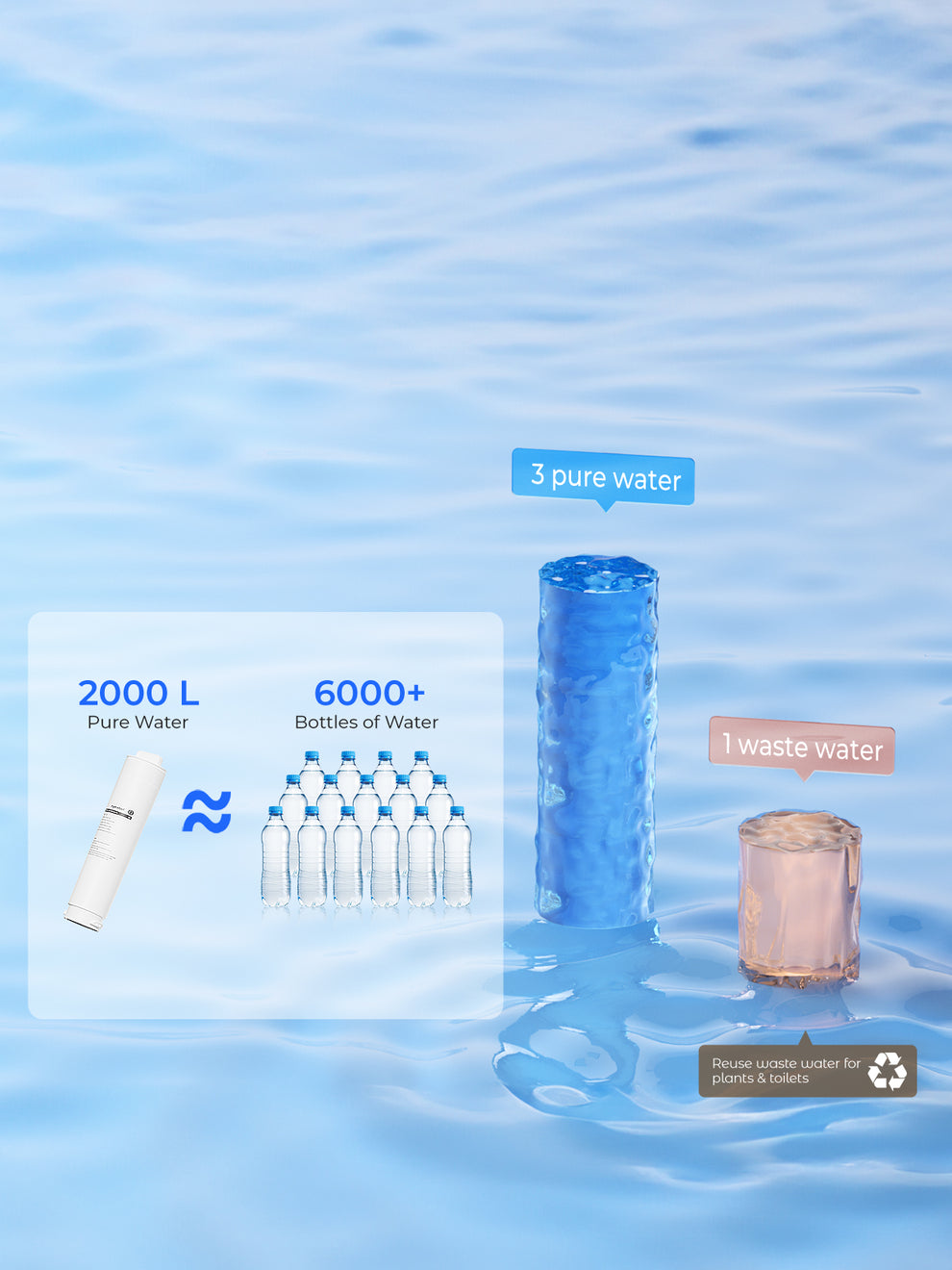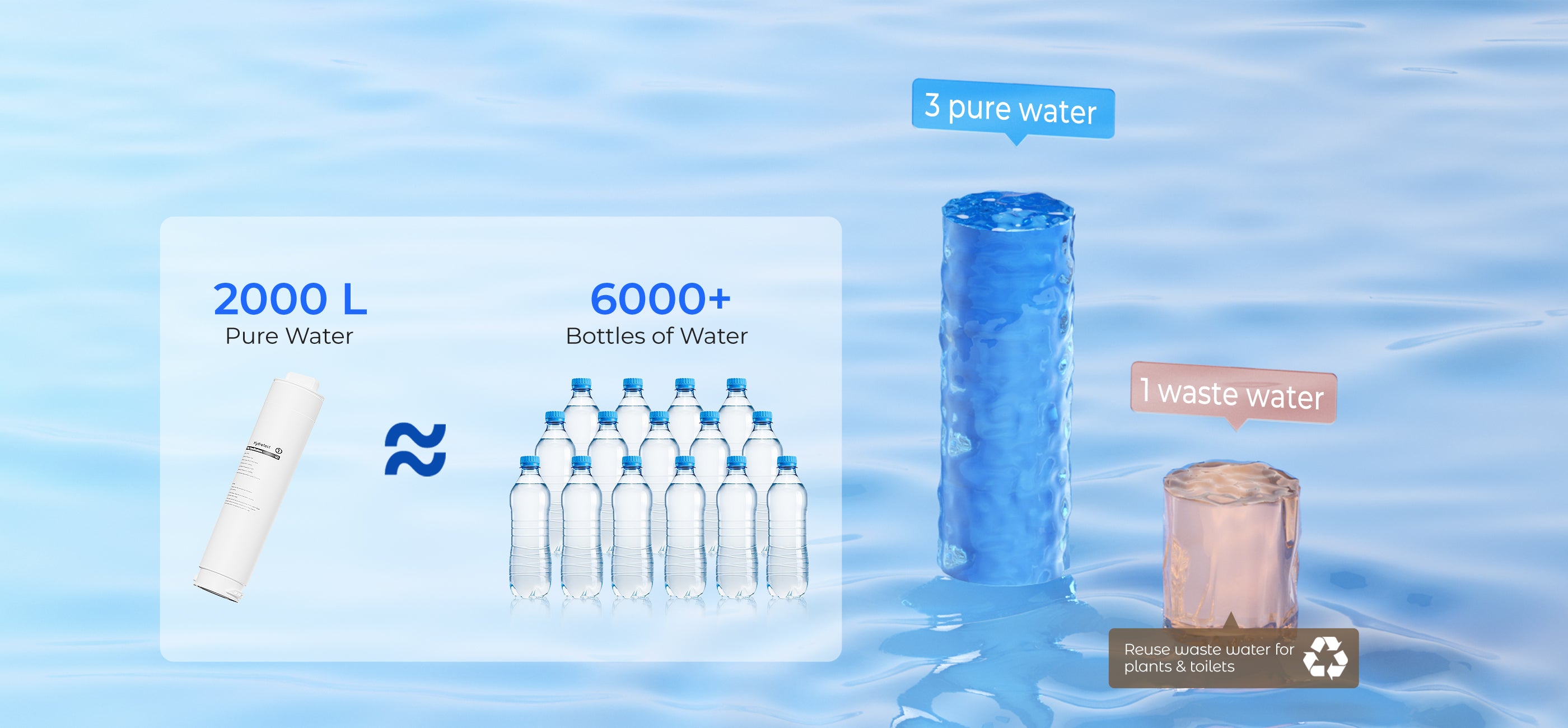 The Hydrofast water purifiers utilize an advanced RO purification system, achieving a 3:1 pure water to waste water ratio to minimize water wastage. A single filter set produces 2000L of purified water, equivalent to reducing the consumption of 6000 plastic bottles, thereby protecting the ecological environment.