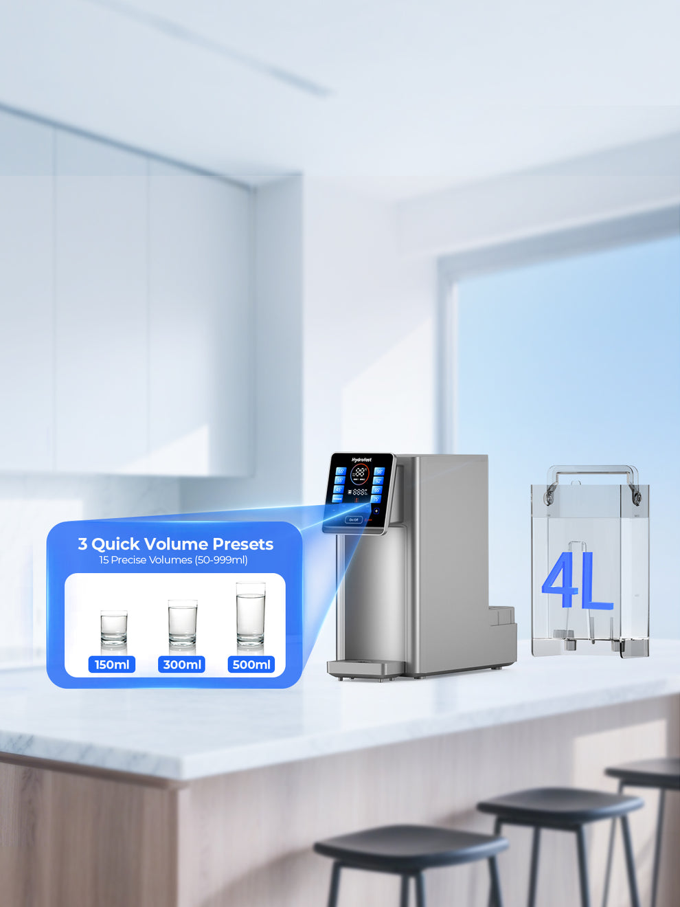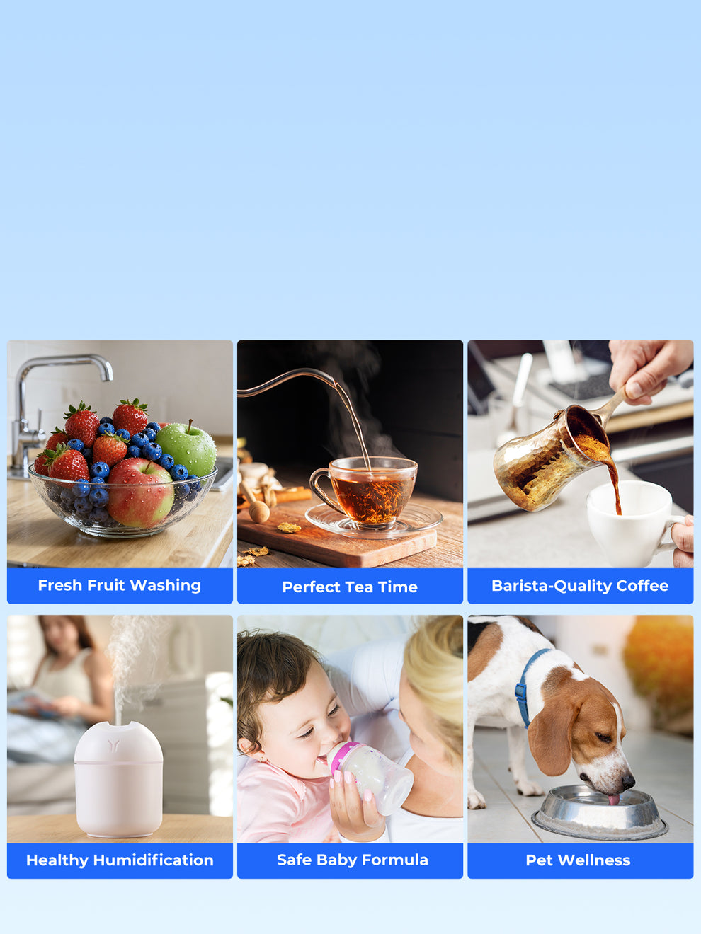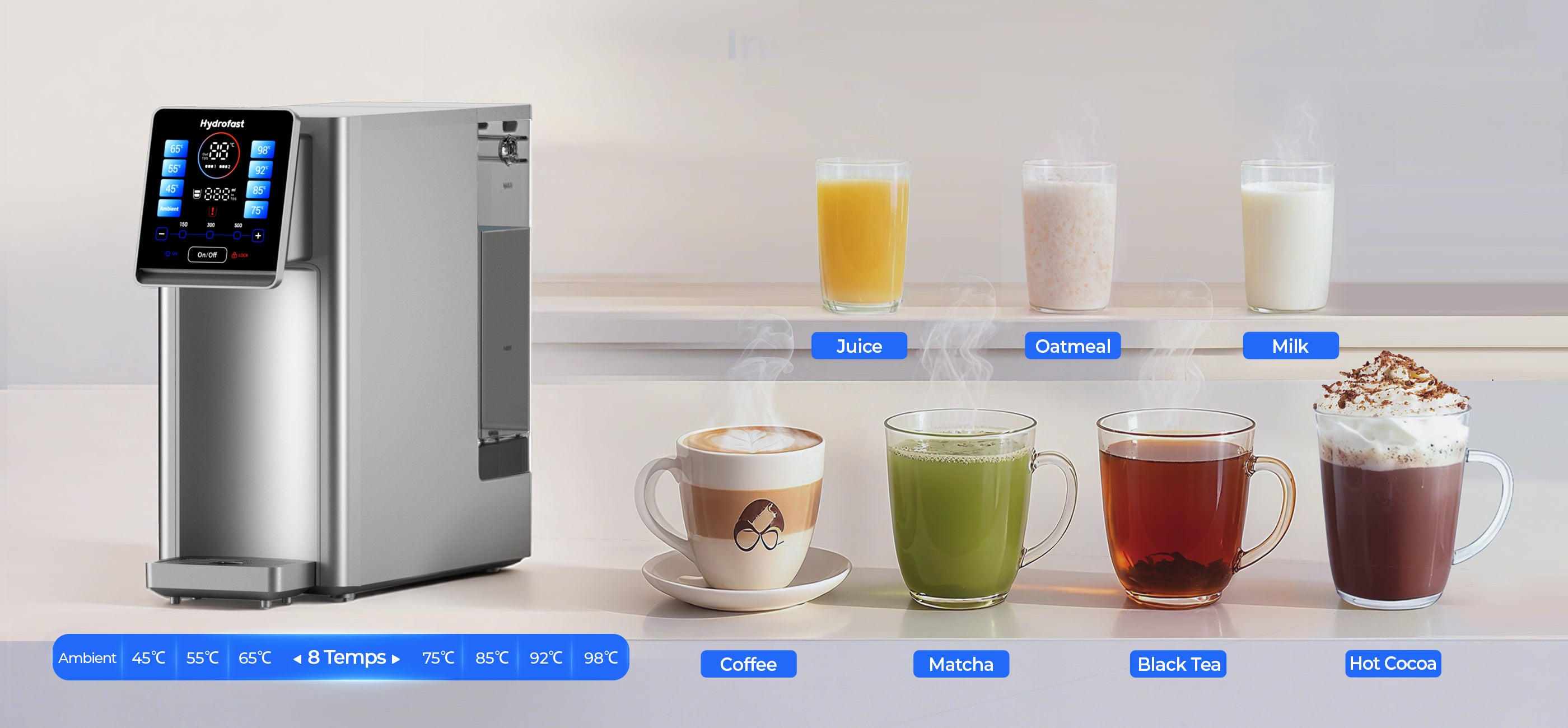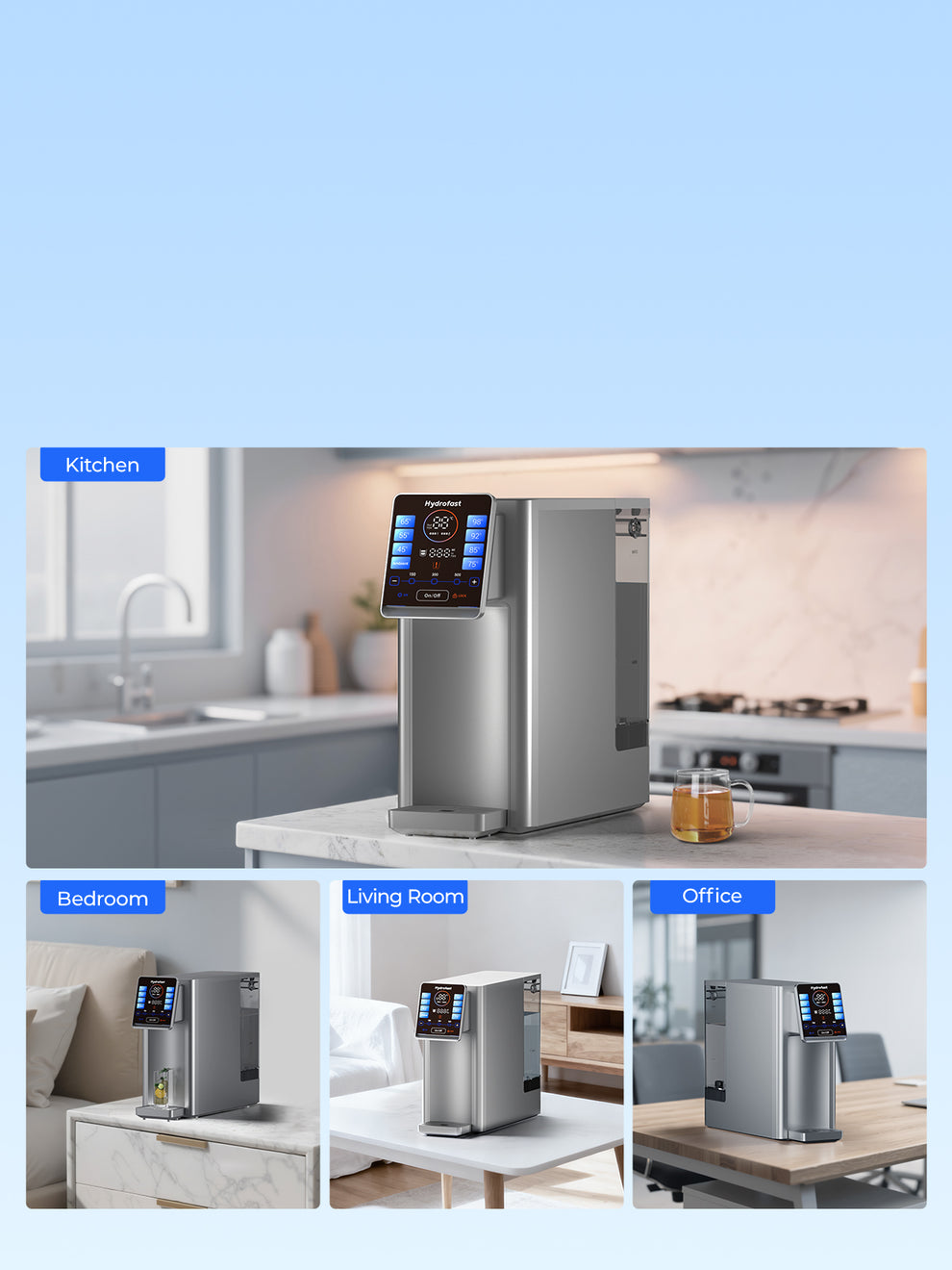 The Hydrofast W100 is designed specifically for small households of 2-3 people. With its slim profile and plug-and-play design, it fits seamlessly into various spaces like living rooms, bedrooms, or kitchens. Customize water temperature and volume to meet needs such as preparing baby formula, brewing coffee, or providing drinking water for pets.