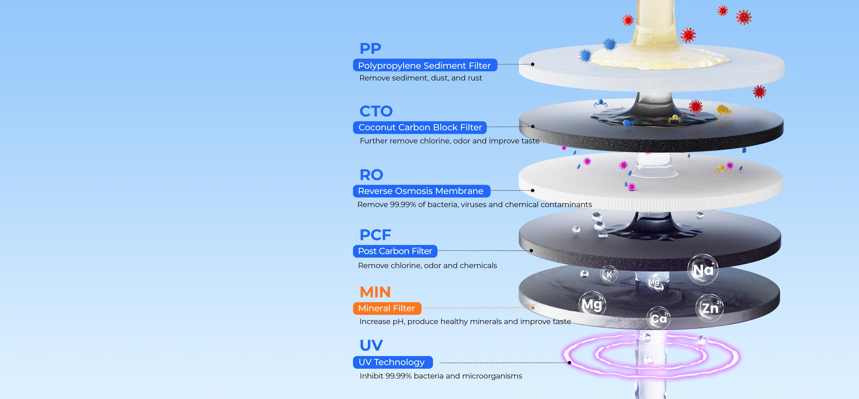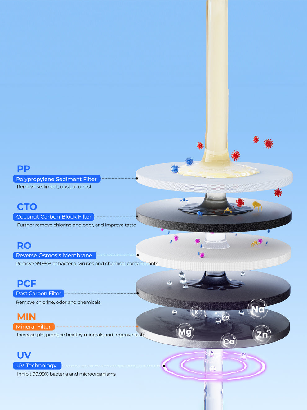 Verwandeln Sie gewöhnliches Leitungswasser in außergewöhnlich reines Wasser mit unserem fortschrittlichen 6-stufigen System (PP-CTO-PCF-MIN-RO-UV) mit einer hochpräzisen 0,0001-μm-RO-Membran. Diese bemerkenswerte Technologie entfernt bis zu 95 % des TDS und über 1.000 schädliche Verunreinigungen, darunter Schwermetalle, Fluorid, Chlor und schädliche Bakterien. Im Gegensatz zu herkömmlichen Wasserreinigern, die dem Wasser seine wertvollen Inhaltsstoffe entziehen, ergänzt unsere hochentwickelte Remineralisierungstechnologie aktiv wichtige Mineralien und harmonisiert den pH-Wert. So erhalten Sie erfrischend reines, mineralreiches Wasser, das mit jedem Schluck optimales Wohlbefinden fördert.