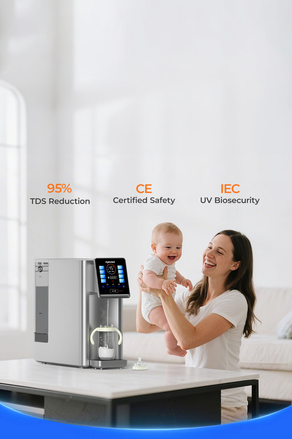 Genießen Sie absolutes Vertrauen in die Reinheit Ihres Wassers dank kontinuierlicher 24-Stunden-UV-Sterilisationstechnologie, die 99,99 % aller Bakterien, Viren und Mikroorganismen eliminiert. Der Hydrofast W100 wird sorgfältig aus BPA-freien, lebensmittelechten Materialien gefertigt und verfügt über strenge professionelle Zertifizierungen. Er bietet höchste Sicherheitsstandards für den täglichen Flüssigkeitsbedarf Ihrer Familie.