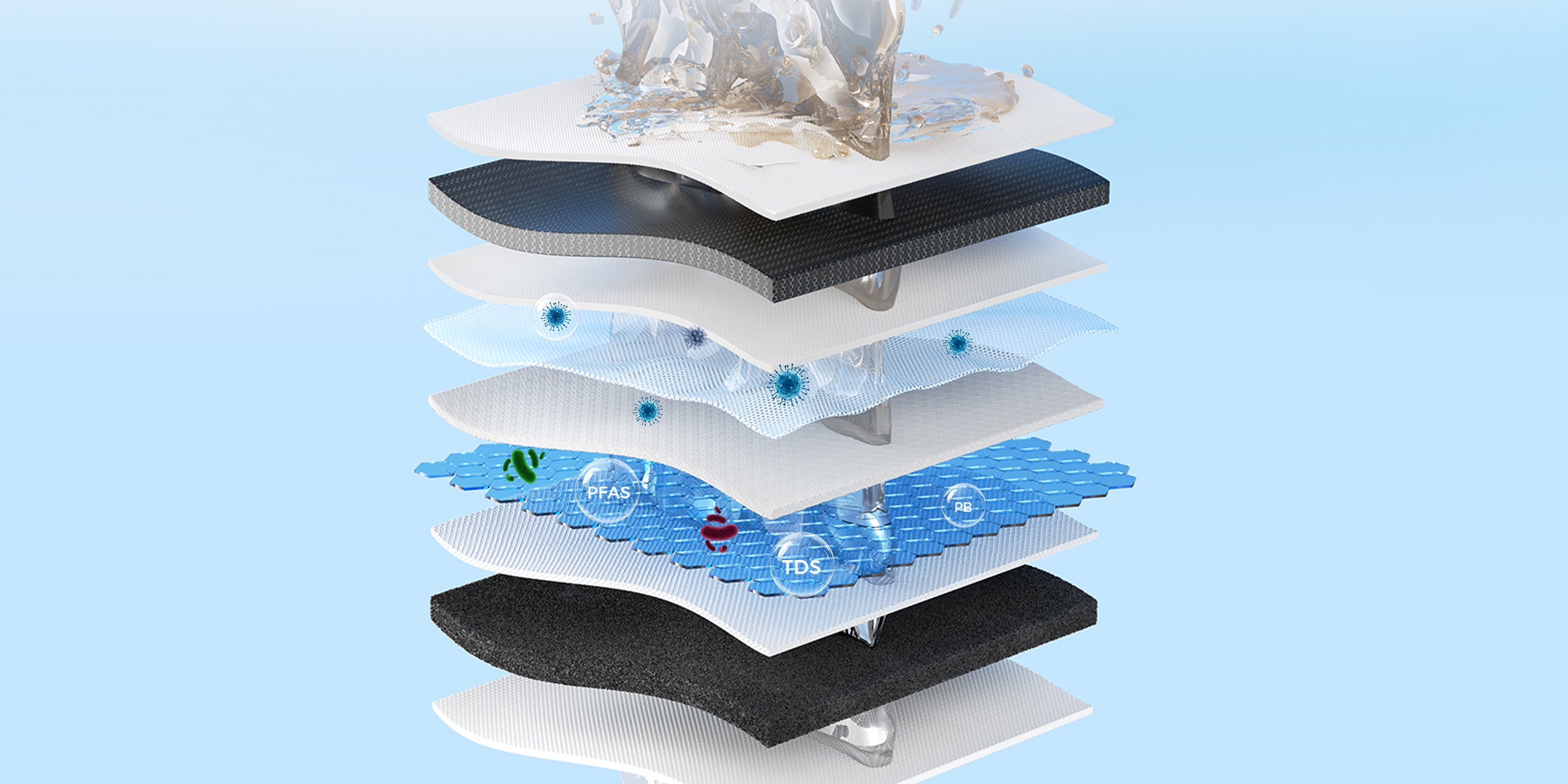 Elimina más de 1000 sustancias nocivas con una eficacia de hasta el 99,99 %, incluidos TDS, PFAS, flúor, cloro y plomo.