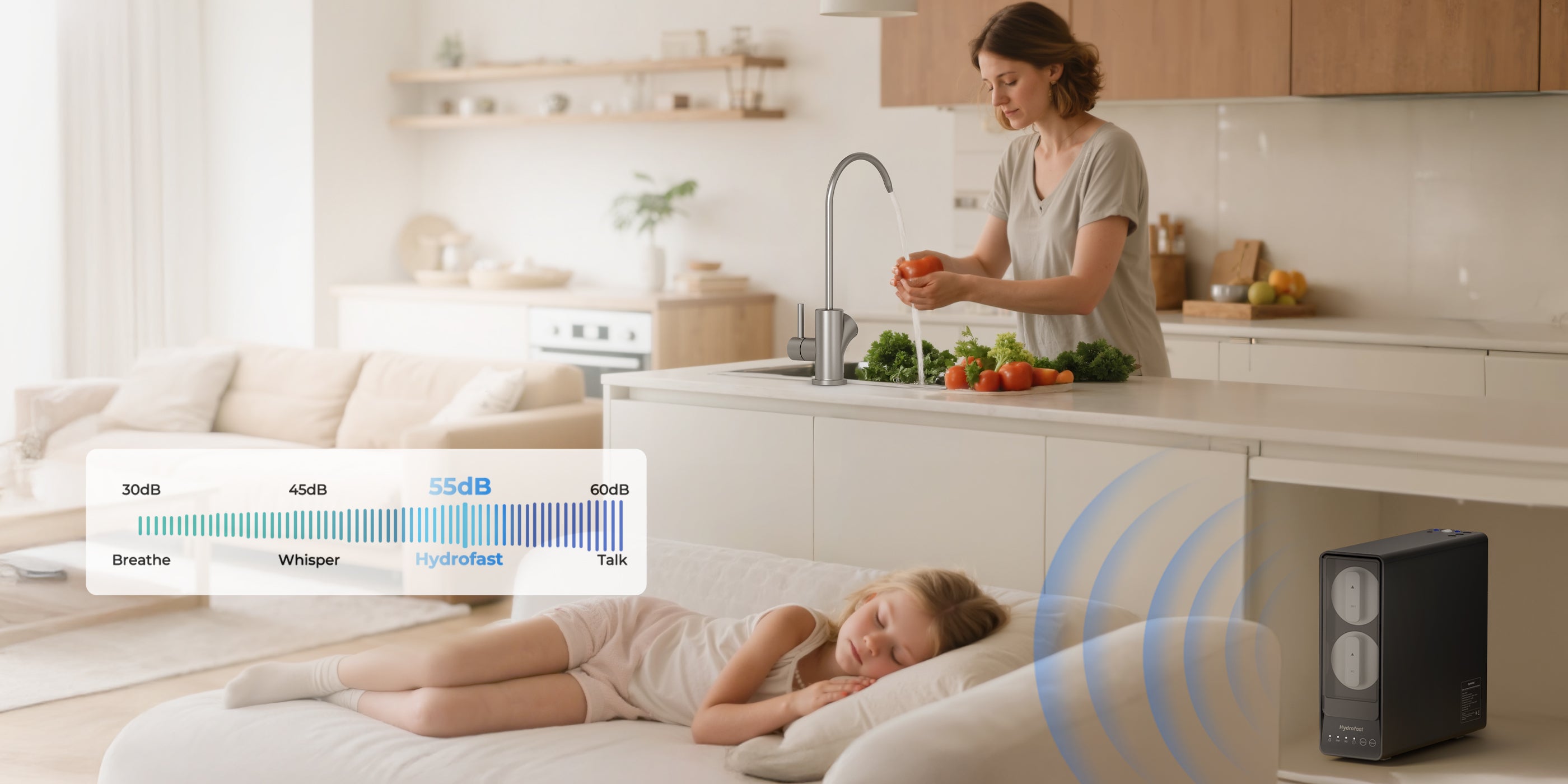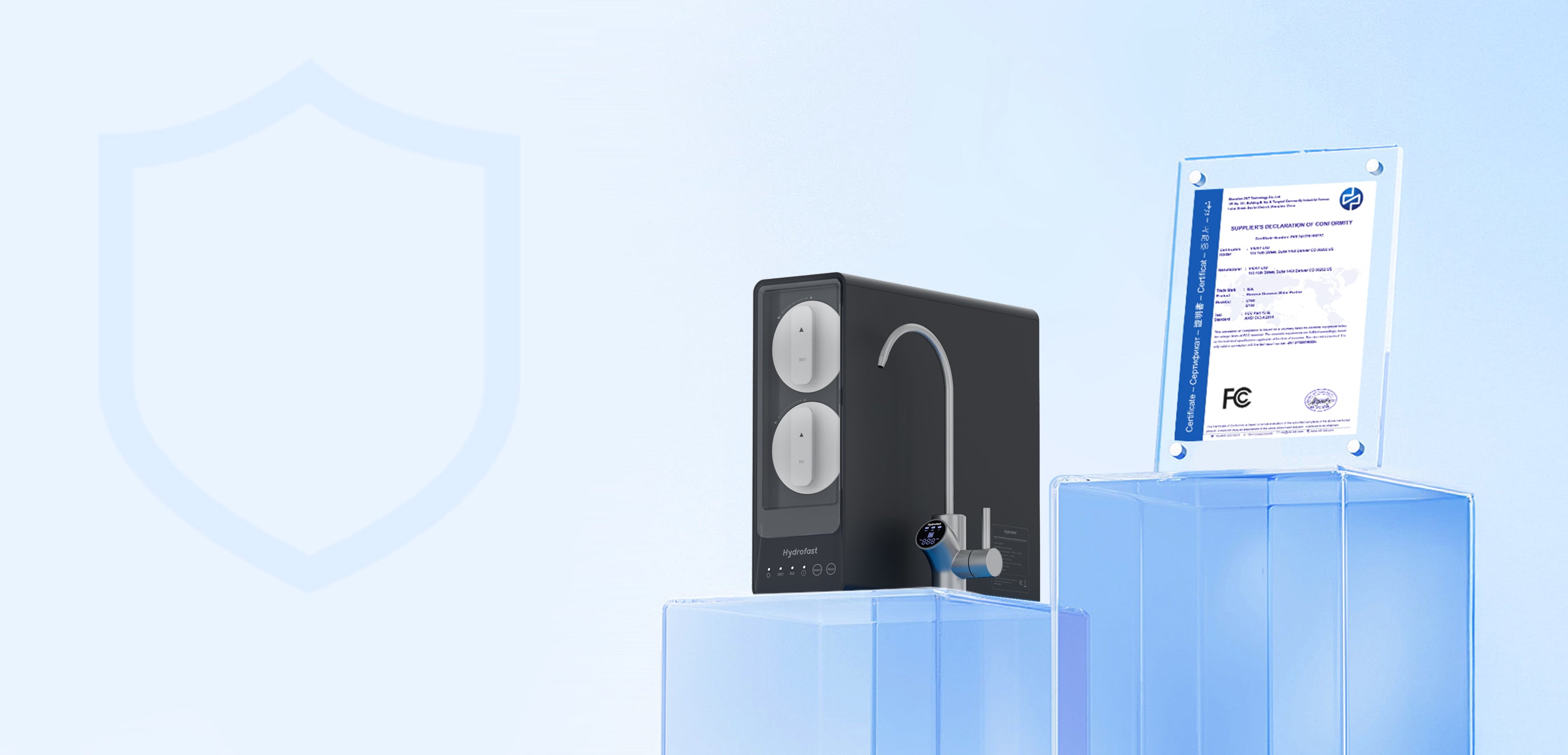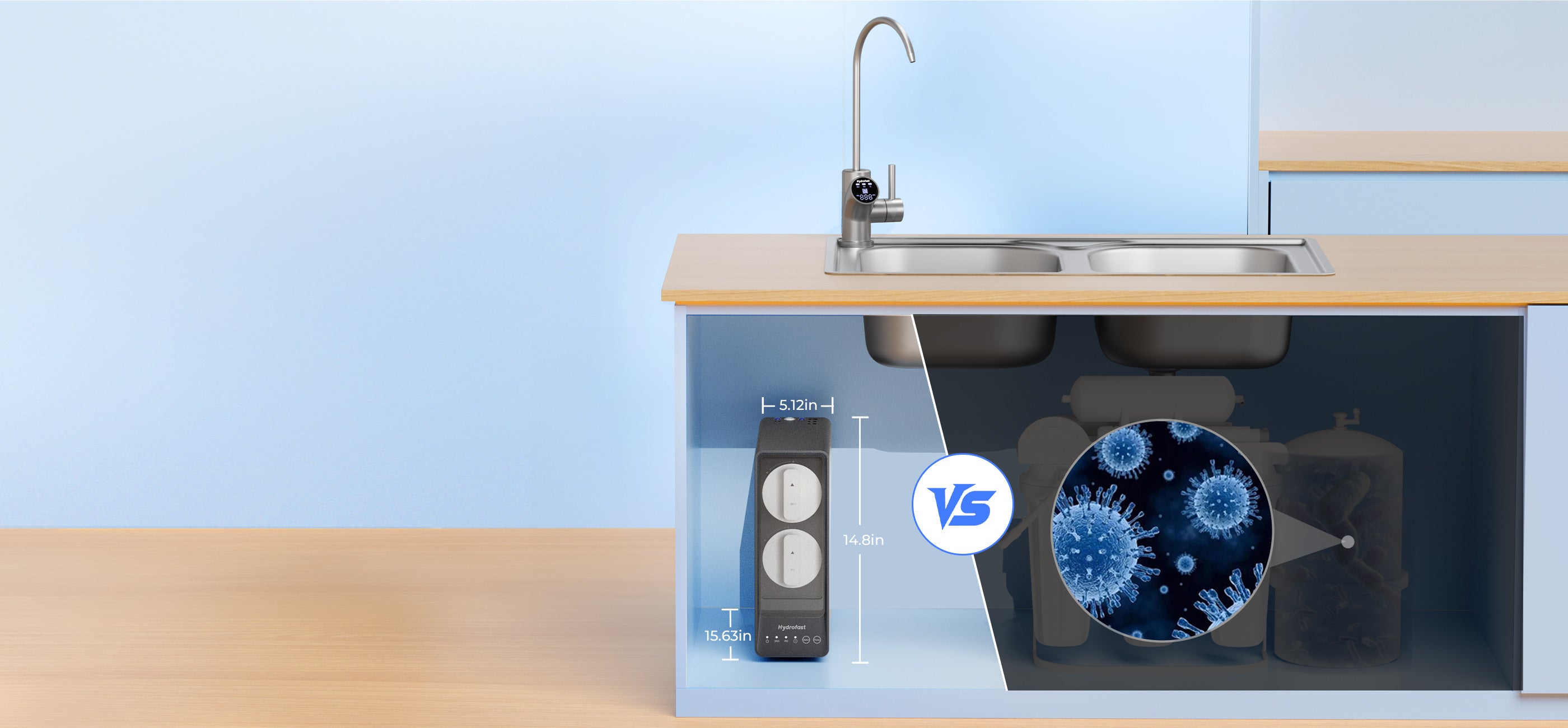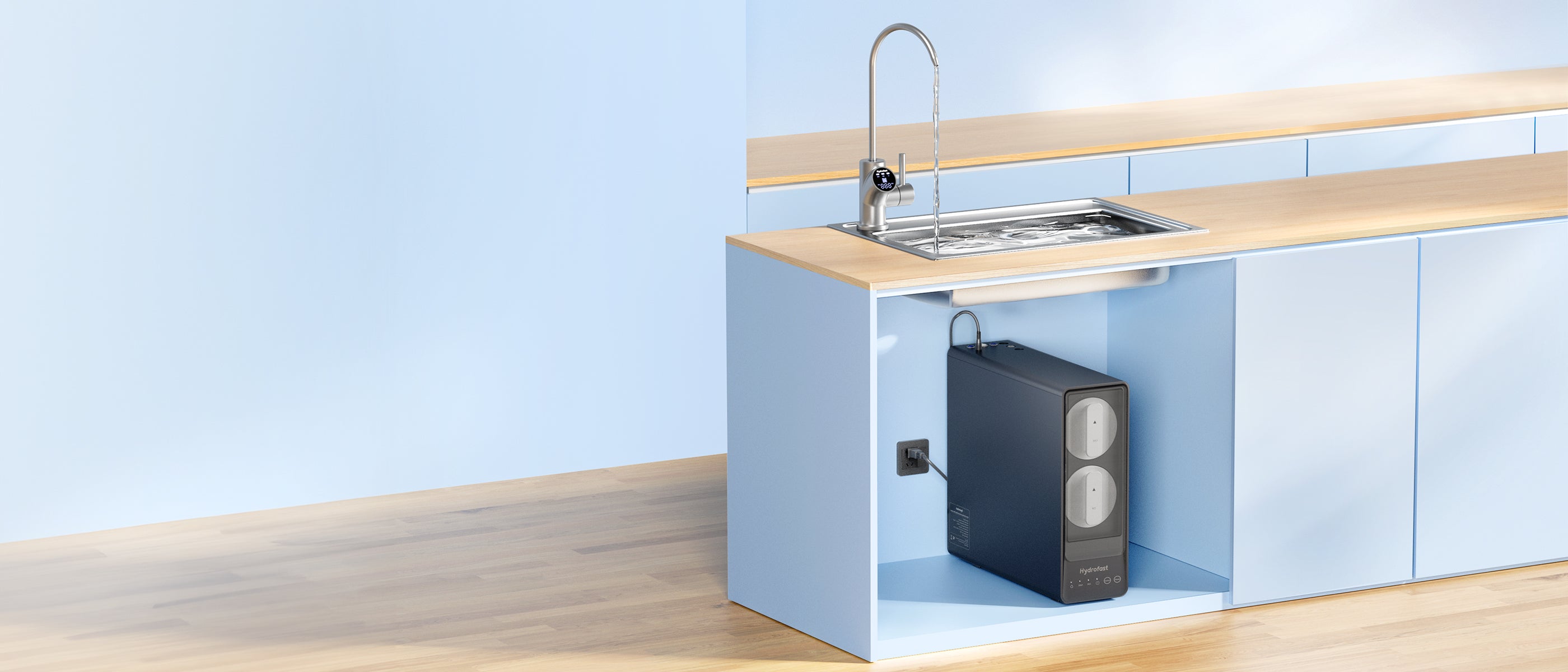 Hydrofast UB200D es un filtro de ósmosis inversa (RO) para instalar bajo el fregadero que ofrece filtración de 9 etapas con esterilización UV y remineralización. Monitorea la calidad del agua en tiempo real con un grifo LED inteligente y ofrece agua purificada al instante con un alto flujo de 800 GPD.