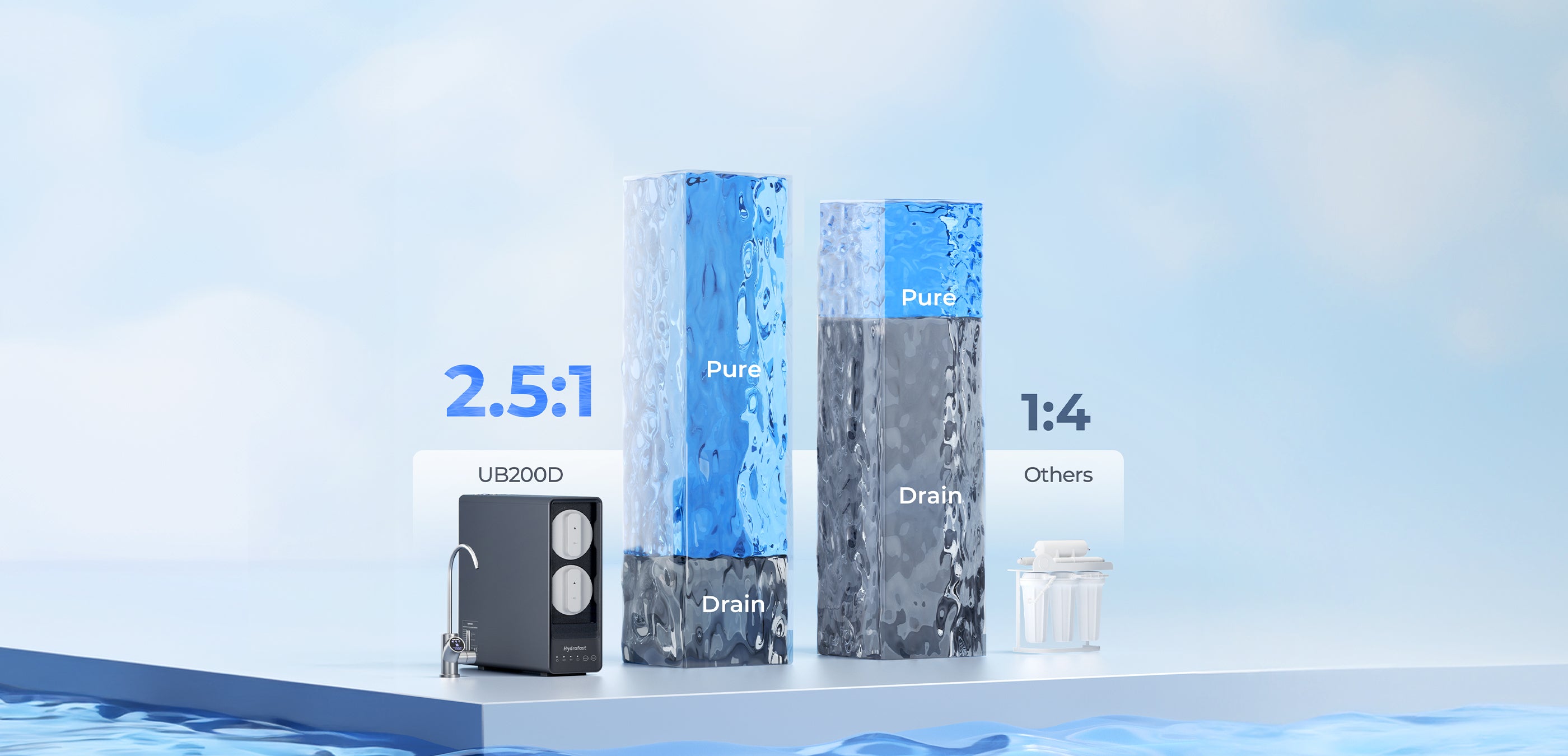 El UB200D cuenta con una relación de agua pura a agua residual de 2,5:1 de alta eficiencia, lo que conserva el valioso recurso hídrico. Con una producción de 800 GPD, ayuda a ahorrar aproximadamente más de 8000 botellas de agua, contribuyendo así a un planeta más verde.