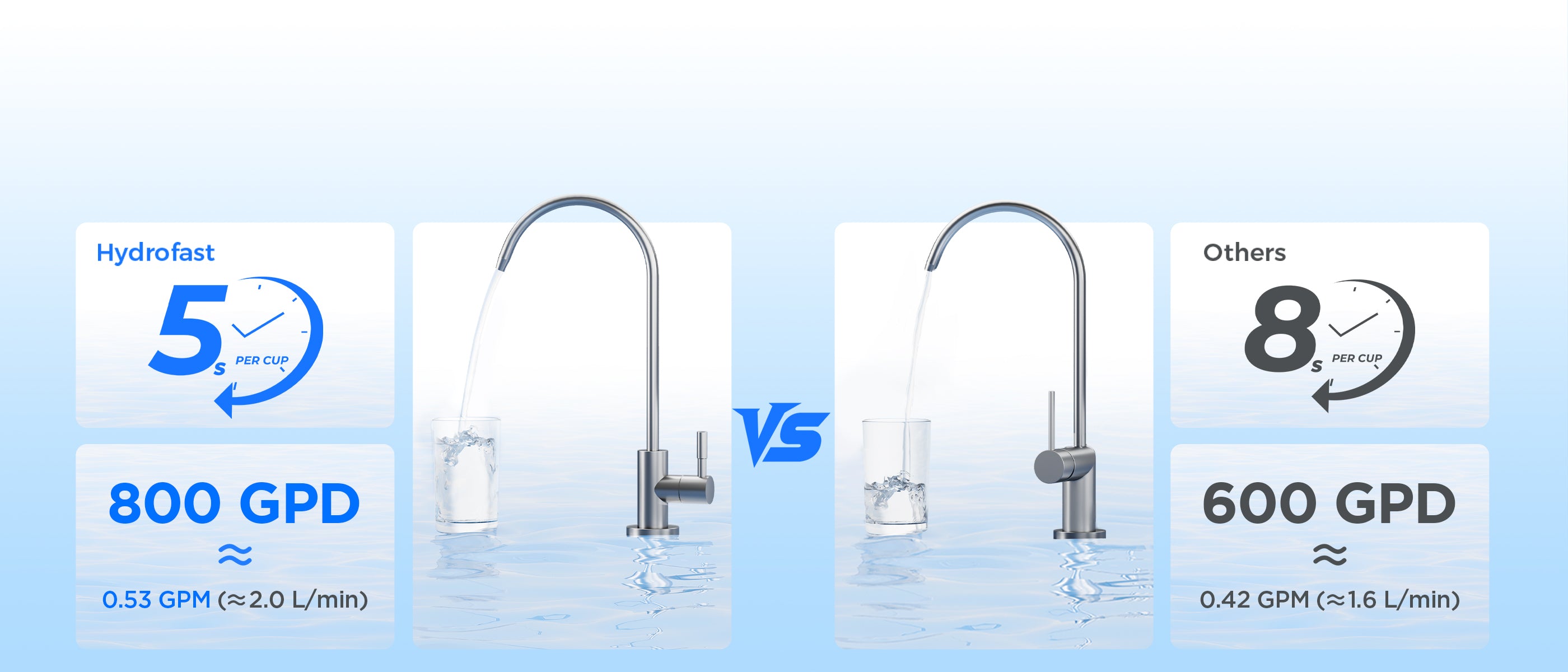 Diseño de alto rendimiento y uso eficiente del agua: Proporciona hasta 800 GPD, llenando un vaso de 8 oz en 5 segundos, con una relación pureza-desperdicio de 2,5:1 que ahorra hasta un 60 % más de agua que los sistemas de ósmosis inversa estándar.