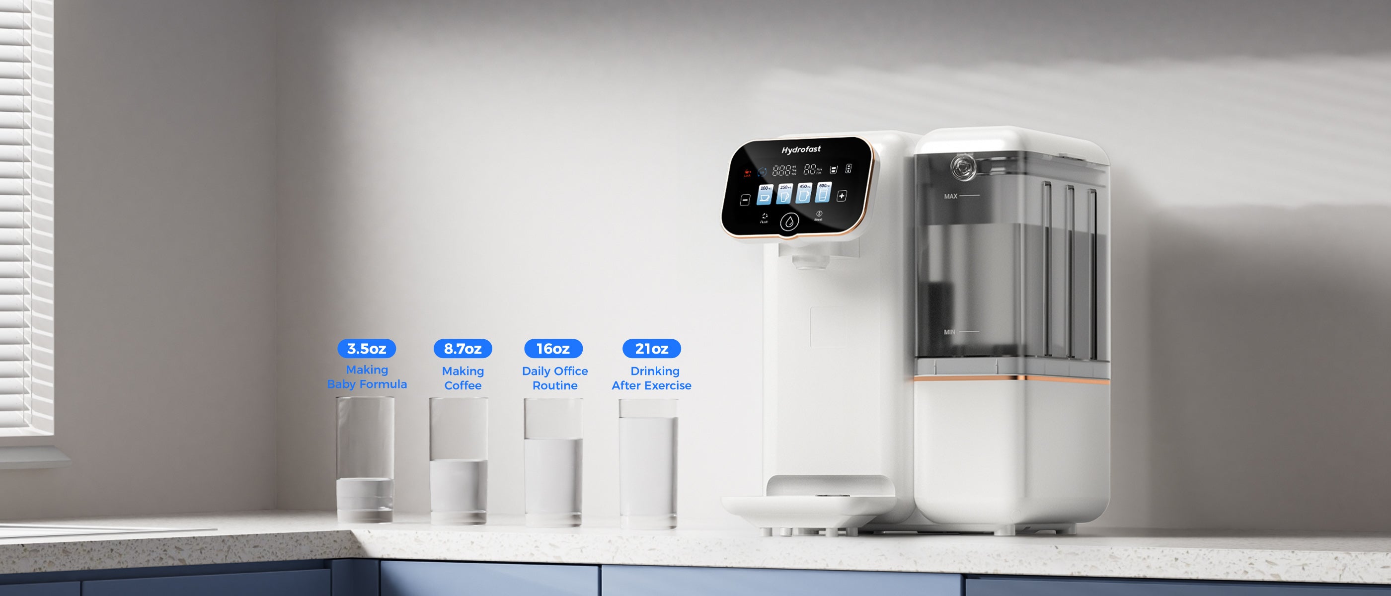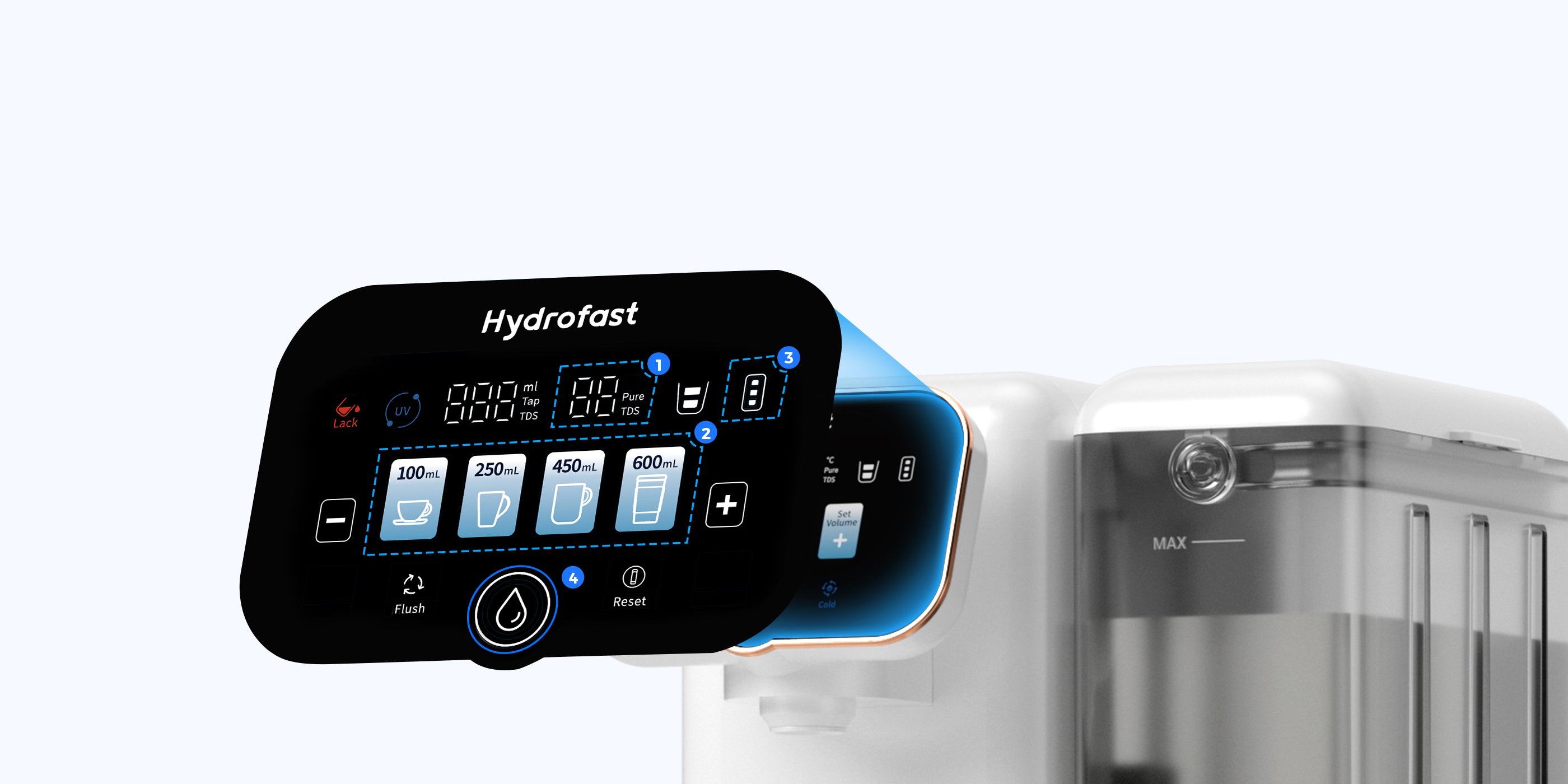 Slim scherm: Geeft realtime TDS-waarden, filterstatus en 4 snelle volumeselecties weer (3,5/8,7/16/21 oz), waardoor de waterkwaliteit zichtbaar is, het filter tijdig vervangen kan worden en er snel water beschikbaar is.
