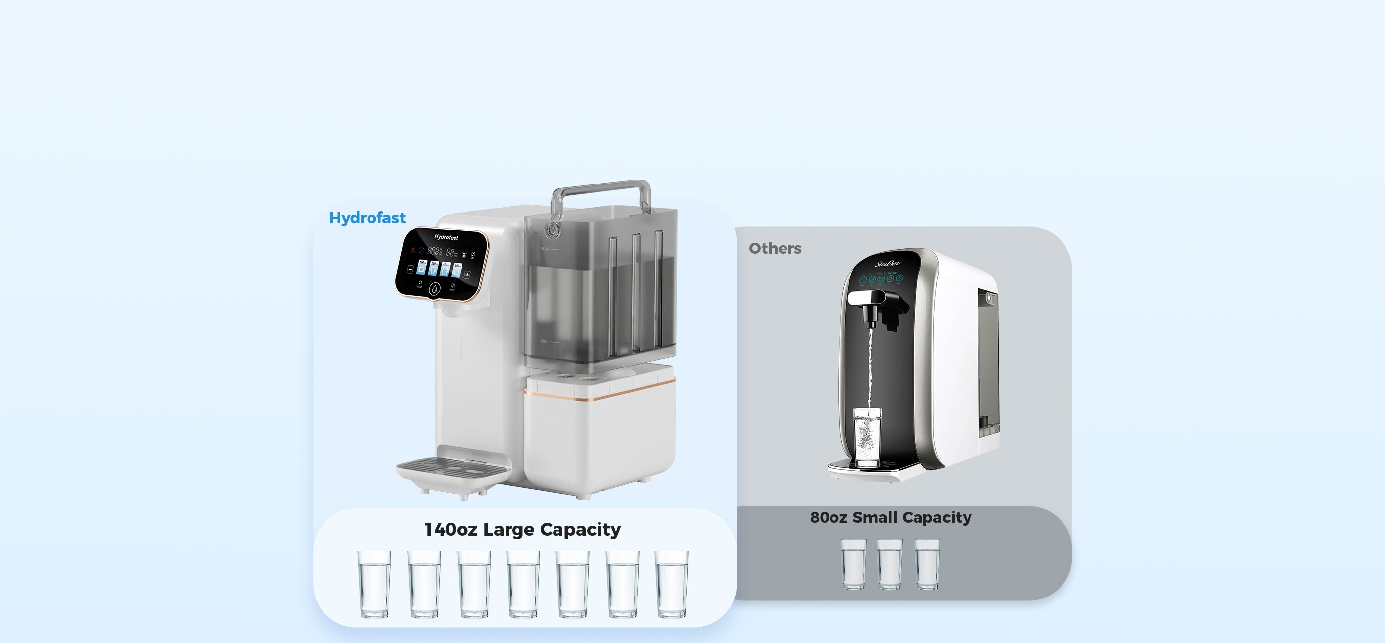 Dankzij het plug-and-play-ontwerp kan het apparaat naadloos in de keuken, woonkamer of op kantoor worden geïntegreerd, zodat u direct kunt genieten van zuiver, veilig en heerlijk smakend water. Met een 4L Met een watertank en een debiet van 100 GPD (gallons per day) voldoet het apparaat aan de dagelijkse behoeften voor hydratatie, theezetten en koffiezetten van huishoudens van 2-3 personen, waardoor het gebruiksgemak wordt vergroot.