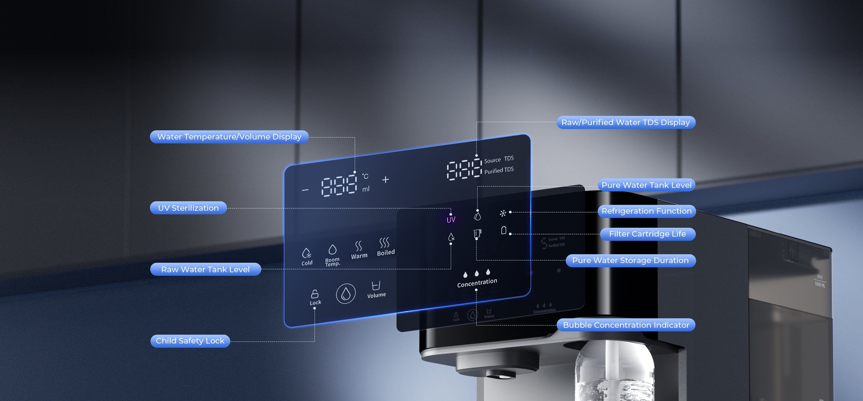 24-Hour UV Sterilization: Continuous ultraviolet sterilization technology eliminates 99.99% of bacteria and viruses, comprehensively enhancing water safety.