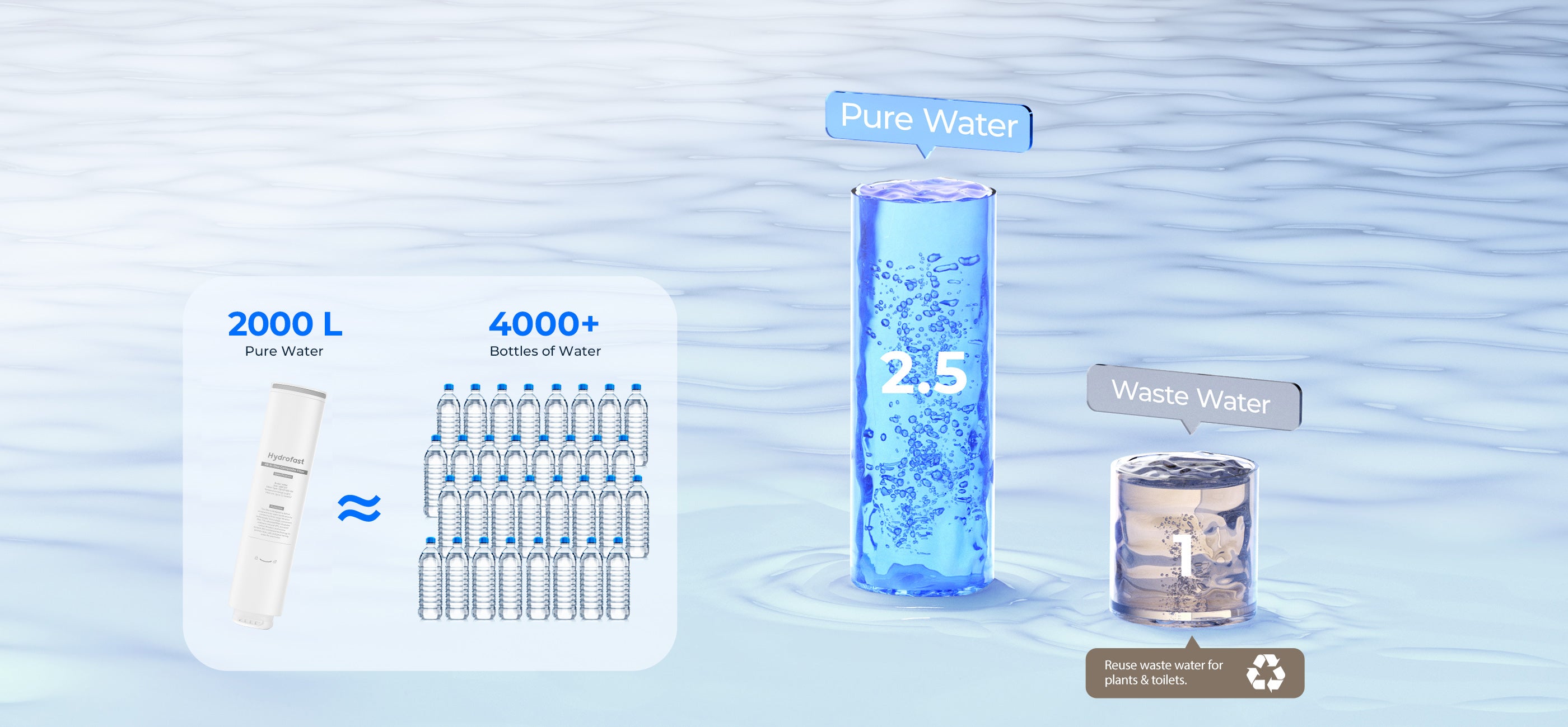 The Hydrofast water purifiers employ an advanced RO purification system, achieving a 2.5:1 pure-to-waste ratio to minimize water wastage. A single filter cartridge produces 2000L of purified water, equivalent to reducing the consumption of 4000 plastic bottles, effectively protecting the ecological environment.