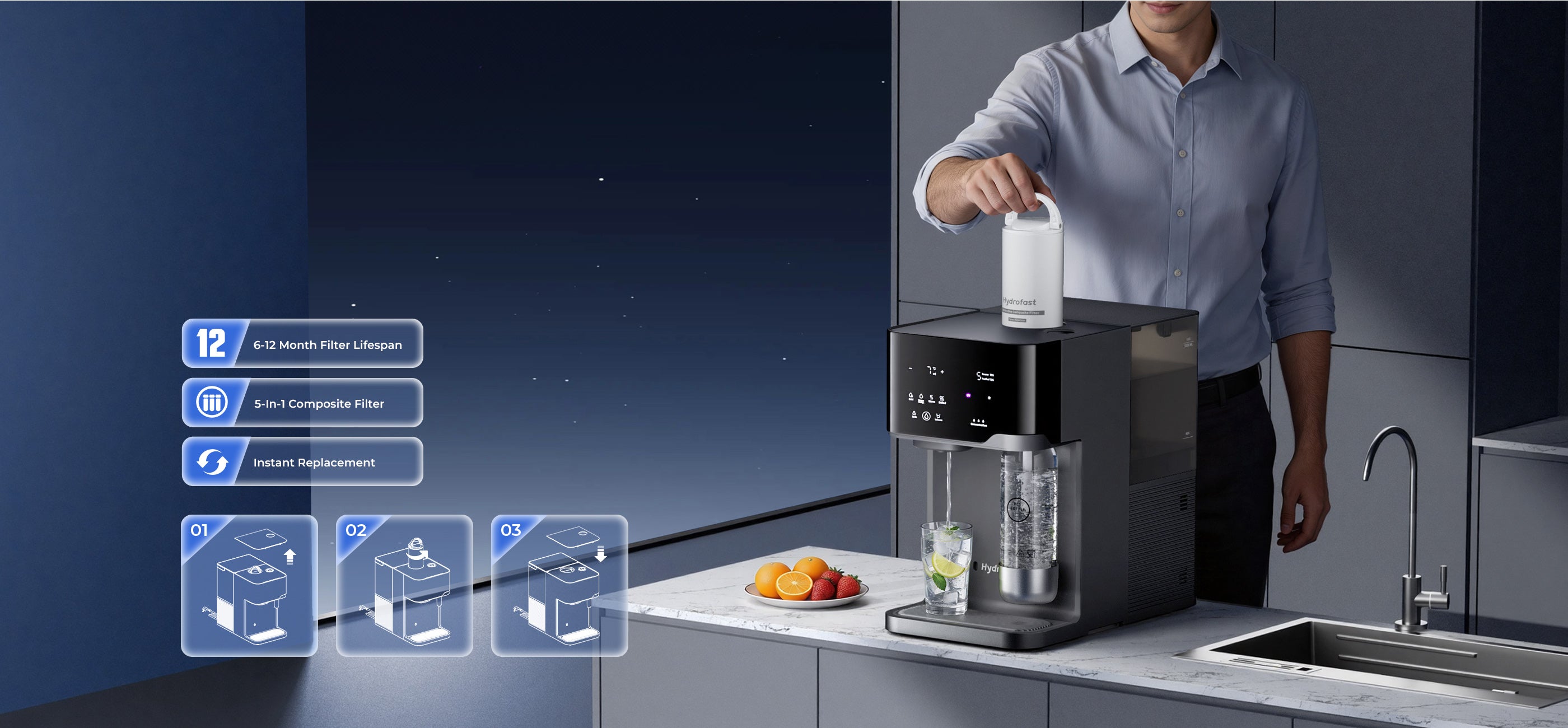 The Hydrofast C300 multifunctional RO water purifier combines sparkling water, iced water, room-temperature water, and hot water in one, catering to the diverse drinking needs of the entire household. Its efficient six-stage filtration system, UV sterilization function, and intelligent TDS monitoring provide multi-layered protection for water quality, ensuring you and your family can enjoy pure, mineral-rich drinking water anytime.