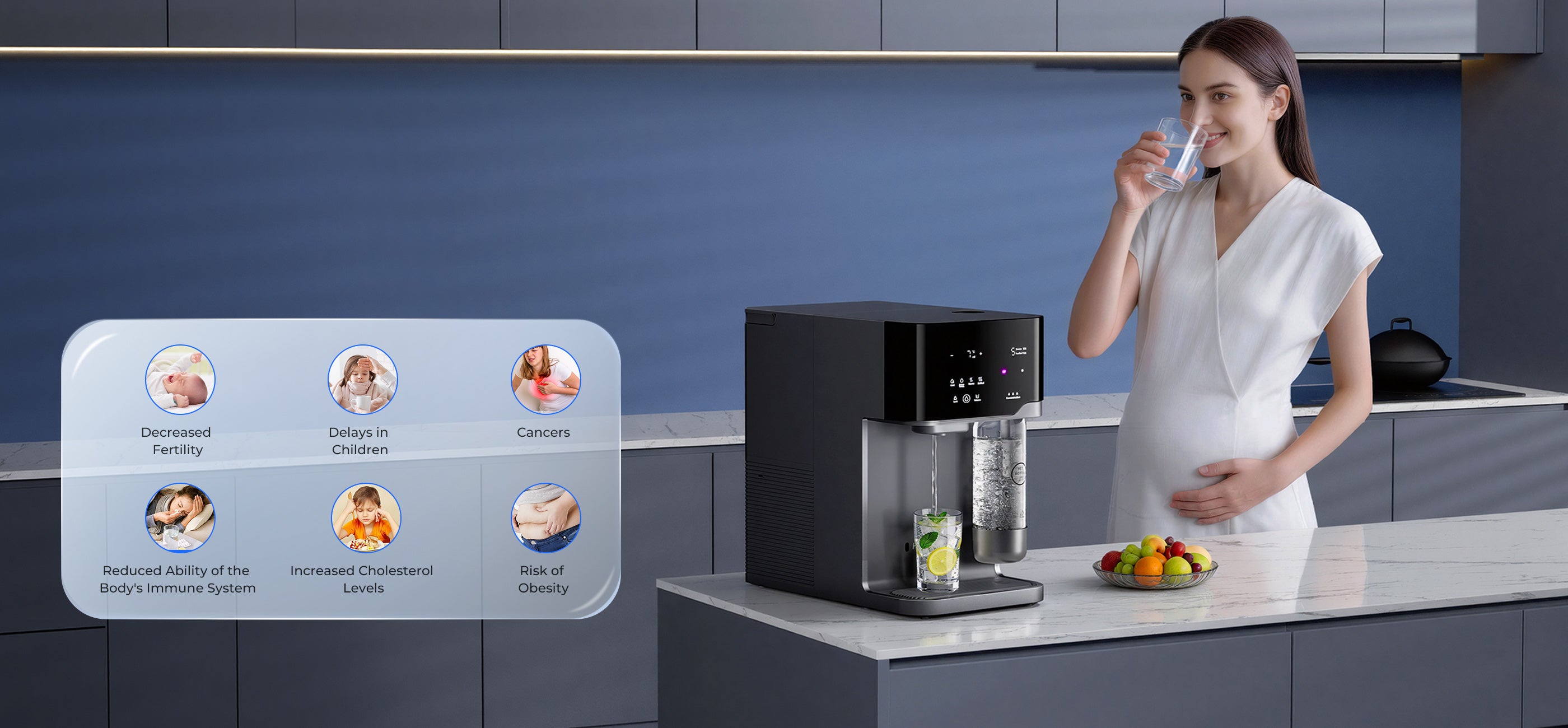 Crisp Sparkling Water: This multifunctional RO water purifier combines filtration with sparkling water production(the CO₂cylinder must be purchased separately), offering straightforward operation. Its integrated 7°C chilled water function enables one-touch dispensing to make refreshing, crisp sparkling beverages.