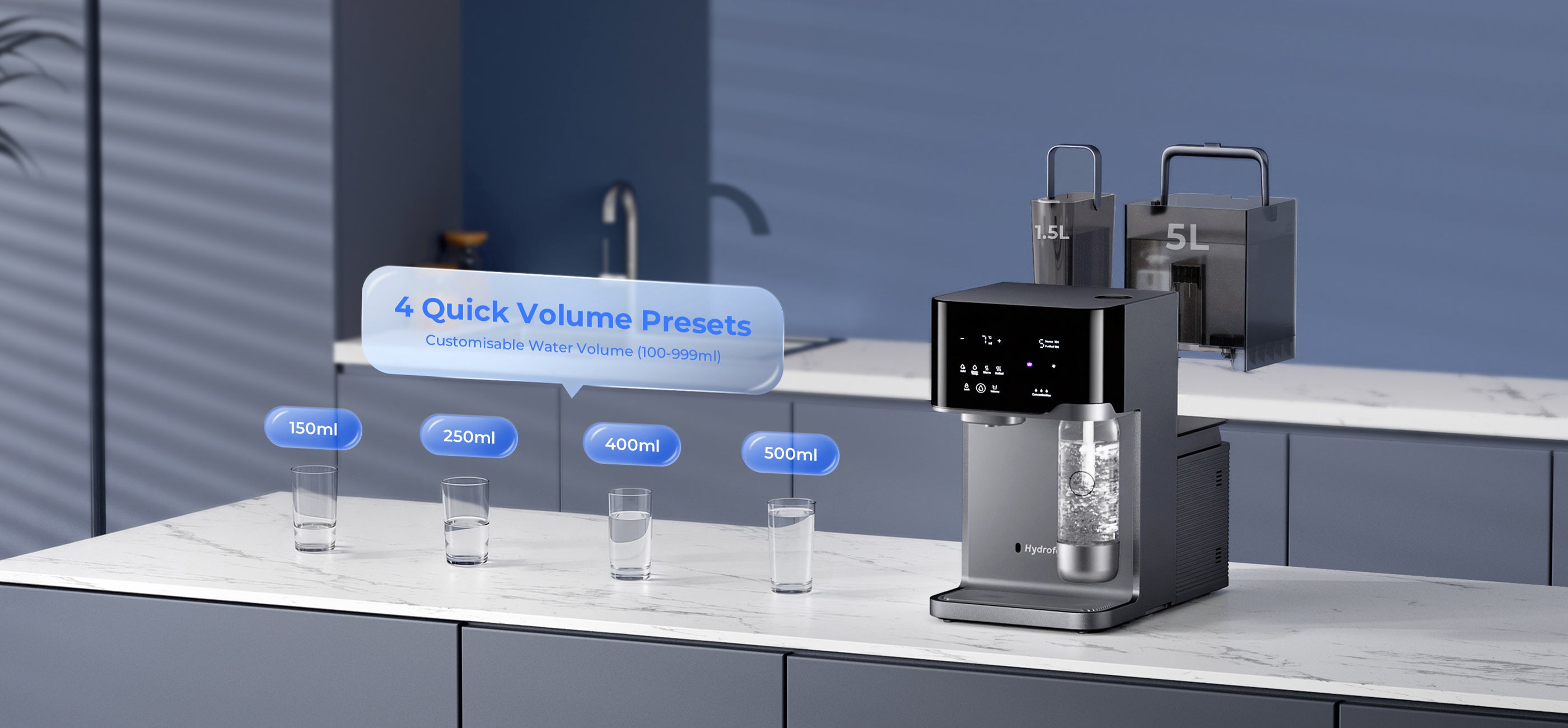 - Volume Dispensing Options: 4 Presets (150/250/400/500ml) + Adjustable Range (100-999 ml)