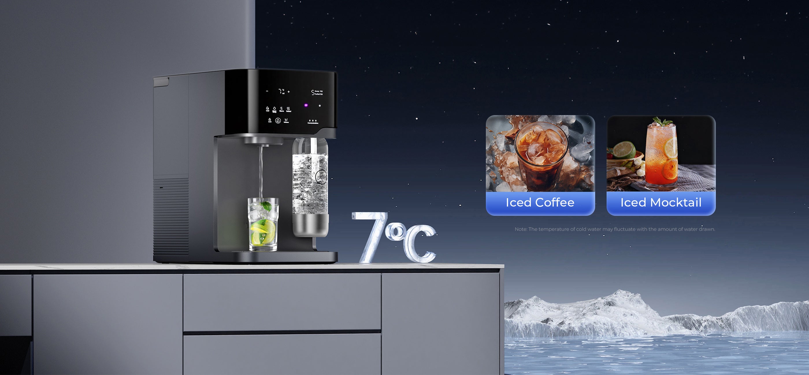 - Water Output Type: Sparkling Water, Iced Water, Room-Temperature Water, Hot Water